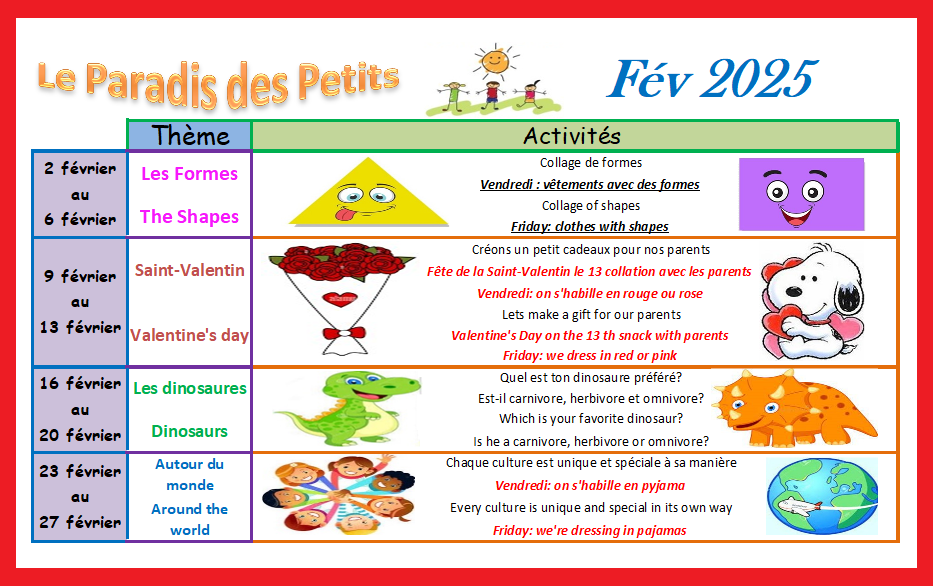 Toutes les semaines, retrouvez les activités, évènements et informations utiles à propos du Paradis des Petits ! Retrouvez les menus et repas de la semaine et les services de la garderie Saint-Jean-sur-Richelieu sur notre site web.